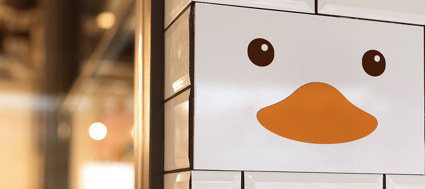 便于鴨子形象的直觀傳播,我們也為莊里鴨創(chuàng)作了品牌IP圖形,以鴨子的面部特征進行直觀體現(xiàn),省略鴨子的身體,放大嘴部特征,越簡單的圖形越容易引起重復(fù)記憶,我們將鴨子面部造型打造成品牌專屬IP形象,形成視覺錘,具有極強的專屬性與識別性,深刻刻印在消費者心智中。