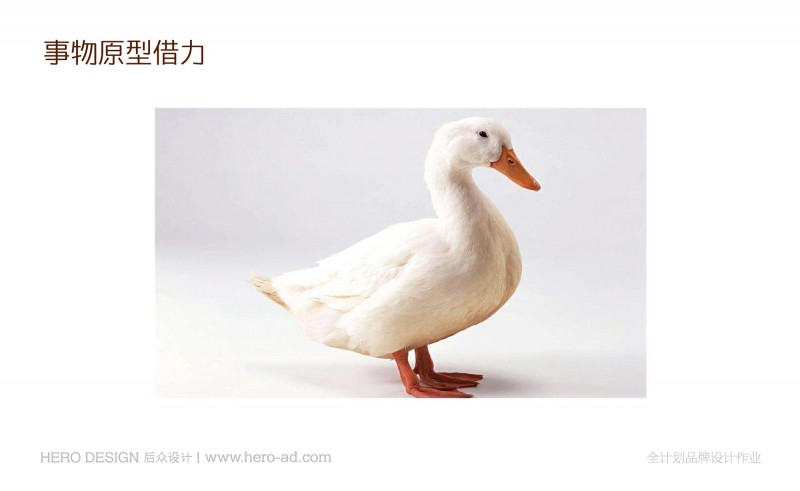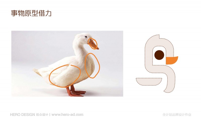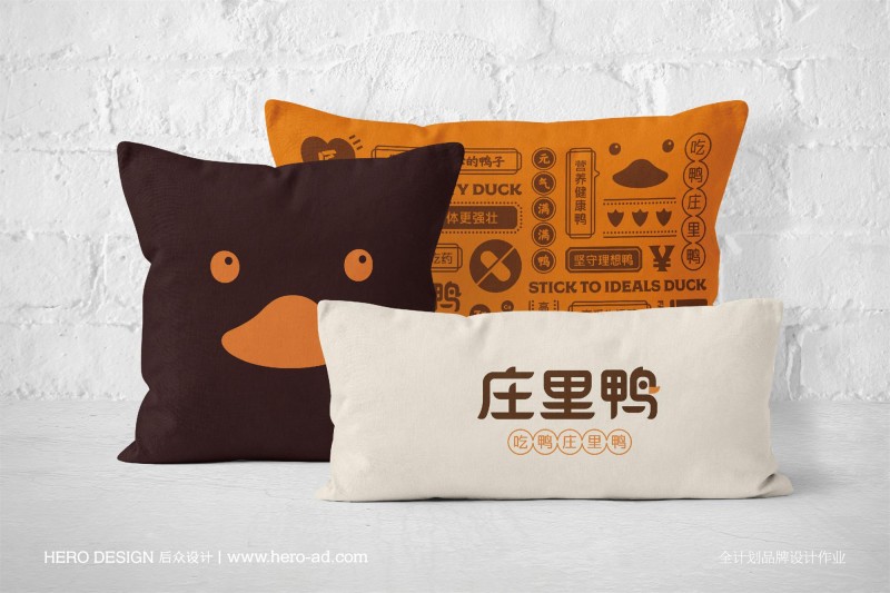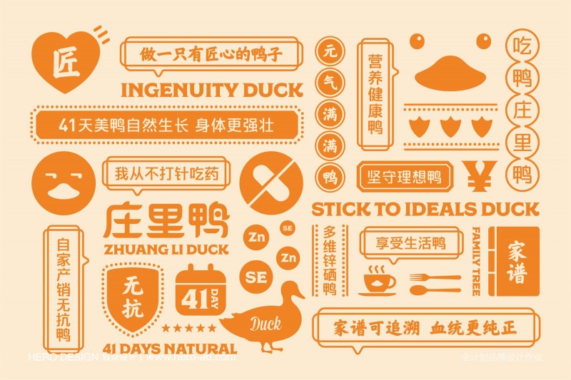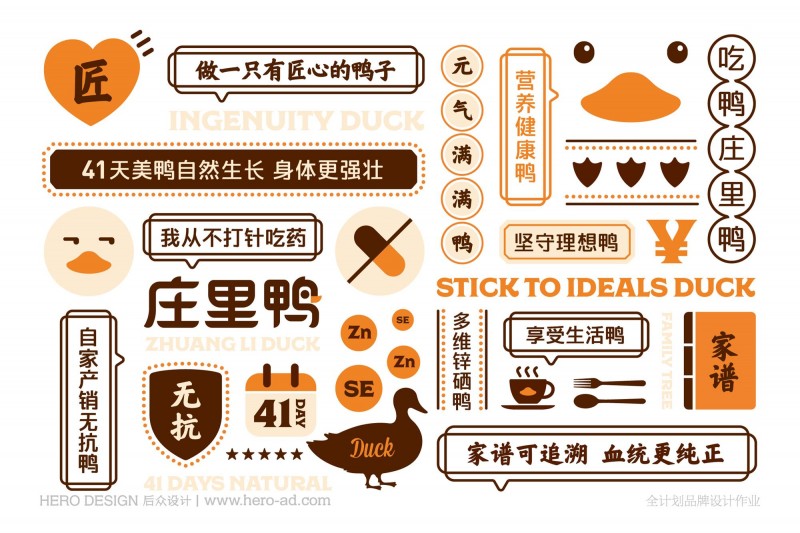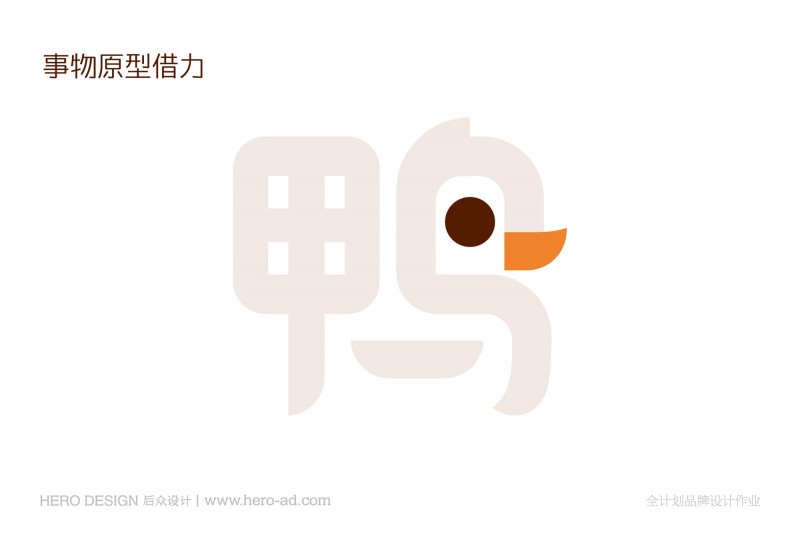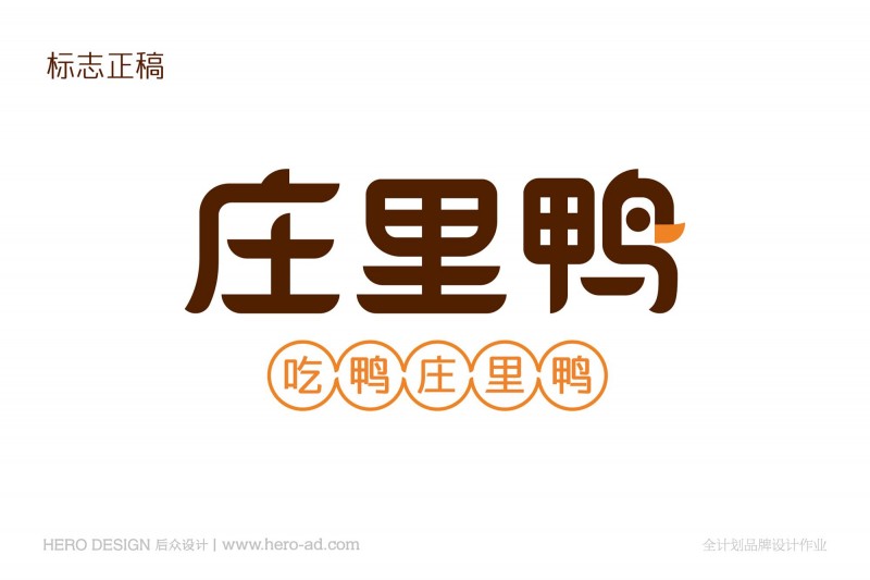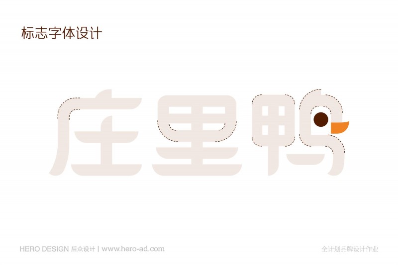 我們將鴨子原型進行特征分析,提煉出鴨子的嘴部、胸部及翅膀的特征,將其特征融入到字體設(shè)計的手法當(dāng)中去,創(chuàng)作了具有鴨子形態(tài)識別性的品牌專屬字體,使消費者直觀、易懂、易記的對莊里鴨形象進行識別,并以此來達到重復(fù)記憶的目的。