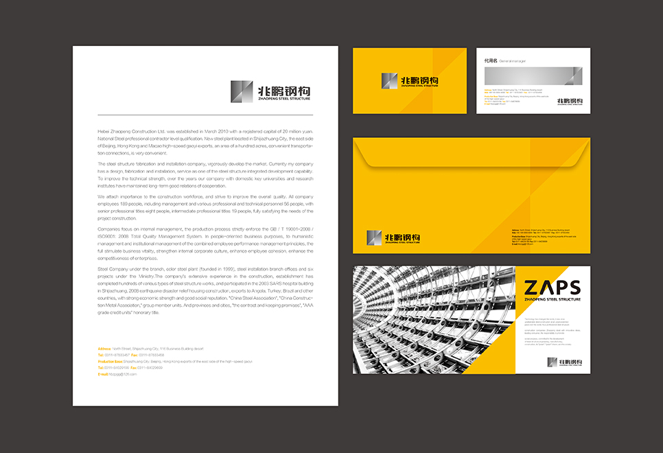 兆鵬鋼構(gòu)標識圖形色彩取自鋼鐵本身顏色,用產(chǎn)品本身的色彩去演繹品牌的獨特魅力。黑白灰色在美術(shù)繪畫中是無色彩傾向的顏色,任何顏色都是始于白而終于黑。在這里,我們用黑白灰來體現(xiàn)所有色彩融合之后的顏色。大千世界,鋼筋建筑演繹出來的是我們心中對現(xiàn)實,對夢想的觀點,可以是紅色,可以是灰色,也可以是綠色,我們將這種鋼鐵本身的色彩設定為濃縮多種色彩后的黑白灰漸變色,使之顯得更具深邃沉穩(wěn)和博大精深。