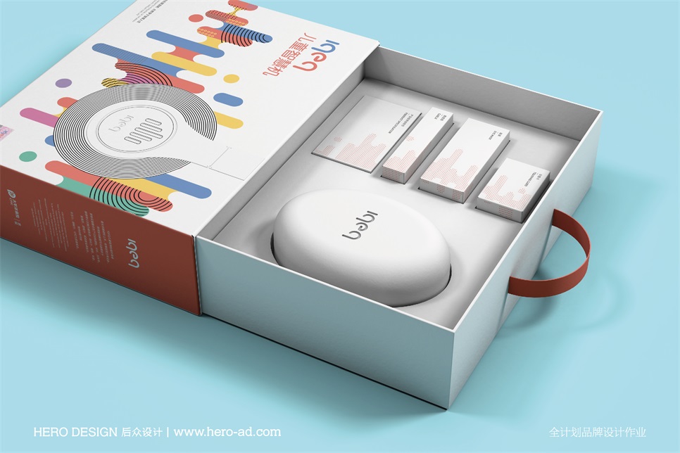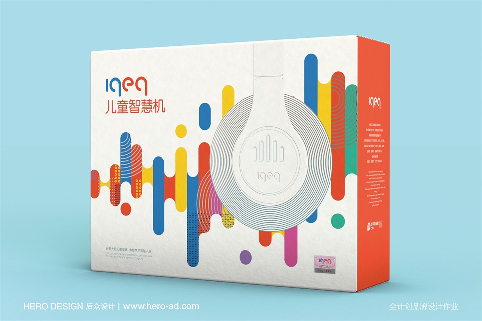 包裝設(shè)計(jì)主畫面以“音波”的形式表現(xiàn),“音波”是IQEQ兒童智慧機(jī)的主要工作原理,通過(guò)將“音波”進(jìn)行創(chuàng)意化設(shè)計(jì),運(yùn)用豐富的顏色變化進(jìn)行拓展,在體現(xiàn)童趣感的同時(shí)也體現(xiàn)了產(chǎn)品的科技屬性。