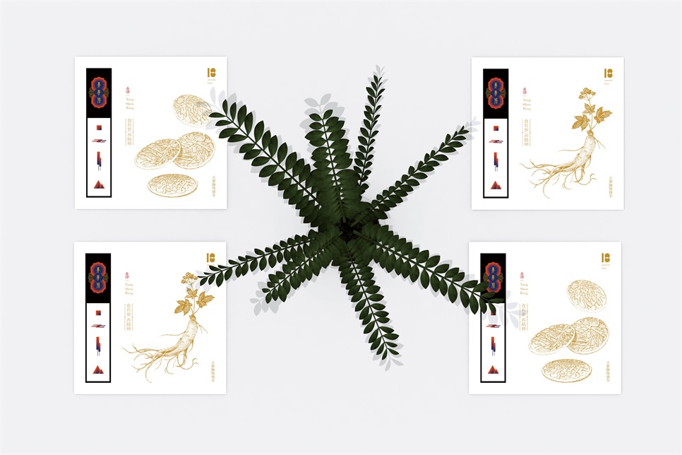 在產(chǎn)品形象設(shè)計環(huán)節(jié),后眾賦予以嶺養(yǎng)參餅一個標(biāo)志形象,在標(biāo)志圖形方面進(jìn)行深入挖掘產(chǎn)品內(nèi)涵,突出“參”與“養(yǎng)”的產(chǎn)品特性;關(guān)于“參”:人參形態(tài)具象繁雜,直接用于標(biāo)志圖形不具簡潔和設(shè)計性,通過后期的觀察與研究發(fā)現(xiàn)人參切片的紋路與色彩層次具有很強的表現(xiàn)力,所以將其提煉再造設(shè)計;關(guān)于“養(yǎng)”:標(biāo)志形象重要突出的就是“養(yǎng)”,在其健康養(yǎng)生理念的基礎(chǔ)上提取樹木年輪的紋路再造設(shè)計,表達(dá)“養(yǎng)”綠色、健康、養(yǎng)身、長久之意。標(biāo)志字體設(shè)計在小篆與隸書的書寫結(jié)構(gòu)基礎(chǔ)上提取人參根須飄逸的形態(tài)作為字體的起筆與收筆,字體結(jié)構(gòu)重心上移、字體瘦長貼合人參形象。標(biāo)志整體形象傳達(dá)新中式概念,與產(chǎn)品定位相吻合。