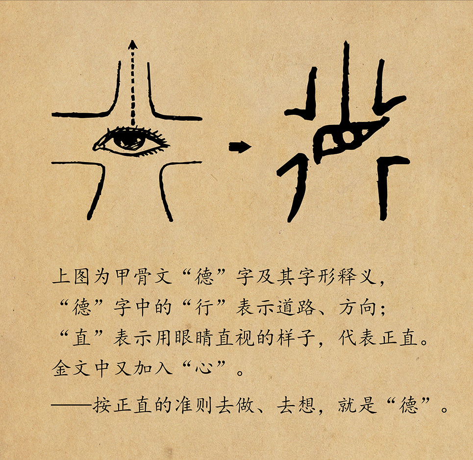 不難看出,“德”字其本意就是每個人心目中對有德之人、之物、之事最根本的認(rèn)知:行正不曲、心正不妄、目正不懼,是為德。