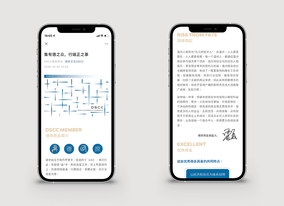 06 運(yùn)用新媒體打造新商會在德庶商會創(chuàng)始初期,微信公眾號成為德庶文化在現(xiàn)實世界里突破空間限制、高效傳播的最佳方式。針對商會的特性,我們?yōu)槠湮⑿殴娞柾莆牡陌l(fā)布制定了相應(yīng)的視覺表現(xiàn)規(guī)范。