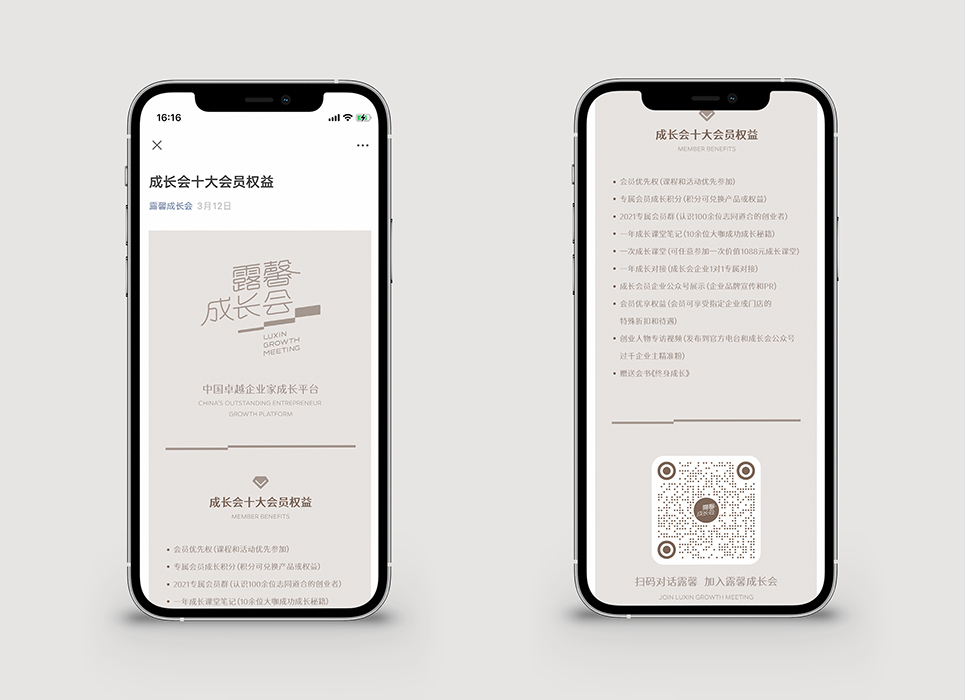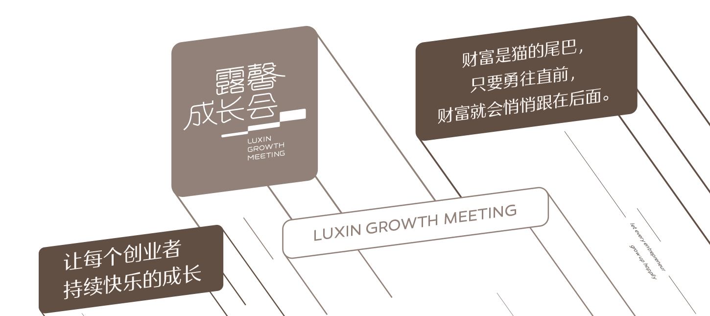 露馨成長會日常傳播物料基于創(chuàng)業(yè)者、成長的概念進(jìn)行可視化設(shè)計(jì),延續(xù)使用階梯的圖形化表現(xiàn),充分展示一個有助于會員奔赴成功的交流平臺的厚重、穩(wěn)健與持續(xù)輸出。