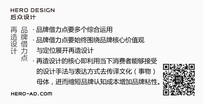 在進(jìn)行品牌借力點(diǎn)再造設(shè)計(jì)時,還應(yīng)值得注意的一點(diǎn)是“當(dāng)代的設(shè)計(jì)手法與表達(dá)方式”。借力點(diǎn)只是文化(事物)母體,是公共舊有資產(chǎn),是經(jīng)過歷史沉淀下來的公共資源,而不是品牌價值的最終呈現(xiàn),針對“母體”我們要進(jìn)行再造設(shè)計(jì),而再造設(shè)計(jì)的核心是利用當(dāng)代或當(dāng)下消費(fèi)者能夠接受的設(shè)計(jì)手法或表達(dá)方式去傳譯我們的公共資源,本質(zhì)在于傳承與翻譯,文化(事物)可以是舊的,但表達(dá)一定是新的,只有這樣才能夠做到縮短消費(fèi)者對于品牌認(rèn)知成本的同時增加品牌粘性,吸引消費(fèi)者重復(fù)消費(fèi)。